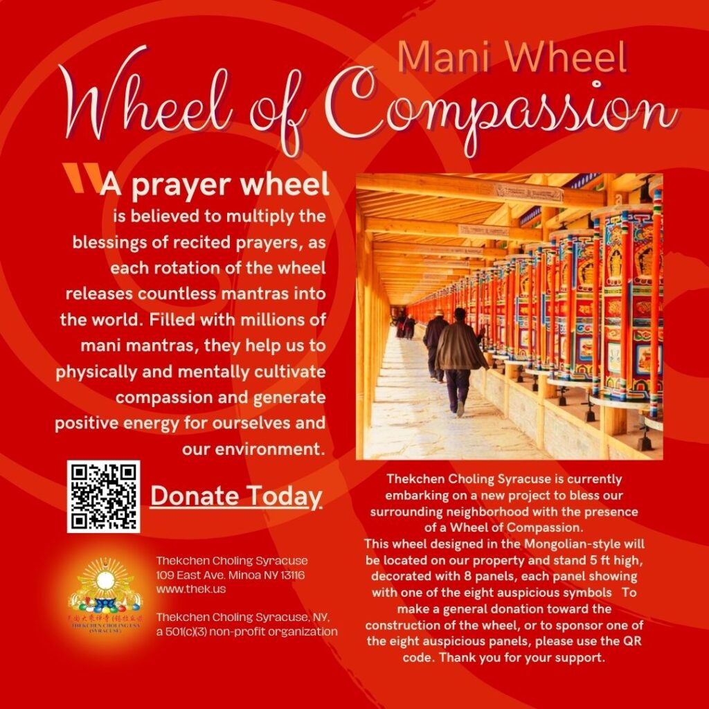 Thekchen Choling Syracuse is currently embarking on a new project to bless our surrounding neighborhood with the presence of a Wheel of Compassion. This wheel designed in the Mongolian style will be located on our property and stand 5 ft high, decorated with 8 panels, each panel showing with one of the eight auspicious symbols.